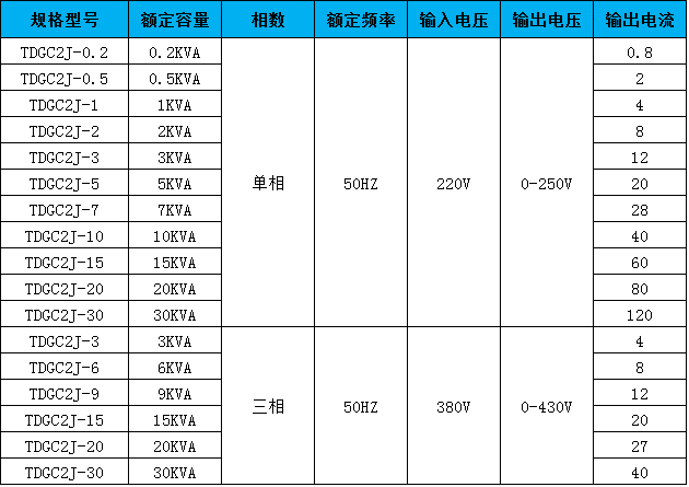 單相調(diào)壓器TDGC常規(guī)輸入電壓220V,輸出電壓0-250V、0-300V、0-500V可調(diào)等,容量可從500VA做到60KVA;特殊電壓、容量按要求定做;