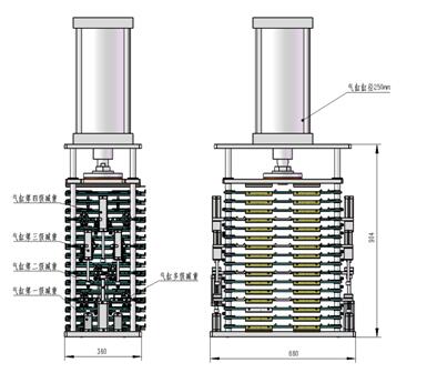 也可設(shè)置四層氣缸減重(每間隔三、四層通過氣缸消除自重),每層壓力差±10KG。