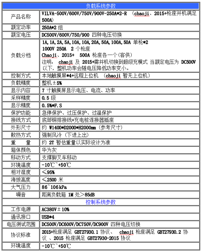 產(chǎn)品規(guī)格:??國標(biāo)雙槍直流充電樁測試負(fù)載VILVA-500V/600V/750V/900V-250A*2-R (chaoji、2015+槍座并機(jī)滿足500A)??