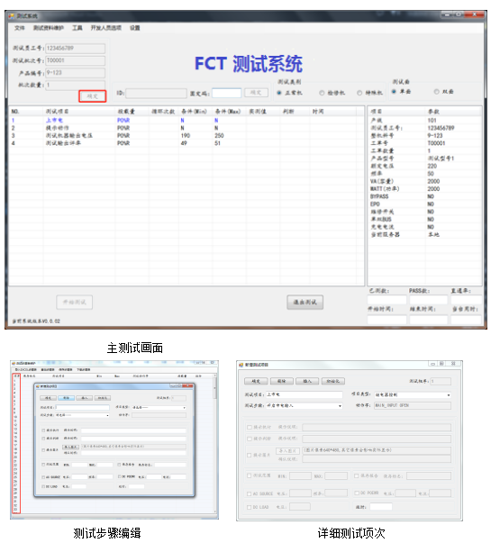 FCT系統(tǒng)測(cè)試軟件通用操作界面,結(jié)果定制化儀器通訊模塊、配電功能、測(cè)試項(xiàng)目。 軟件可編緝系列產(chǎn)品測(cè)試項(xiàng)目,對(duì)應(yīng)不同產(chǎn)品料號(hào)可以存儲(chǔ)對(duì)應(yīng)測(cè)試程序。方便產(chǎn)線作業(yè)人員操作及管理人員維護(hù)及編程。同時(shí)預(yù)留MES鏈接功能(需要與工廠端系統(tǒng)定制代碼) 主要界面如下: