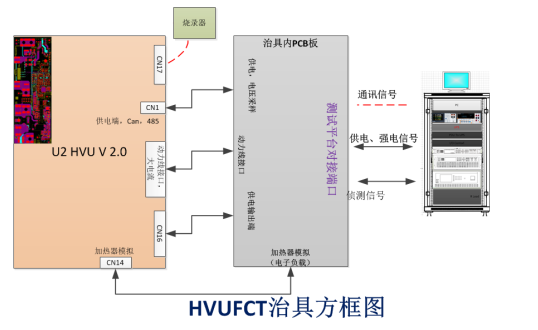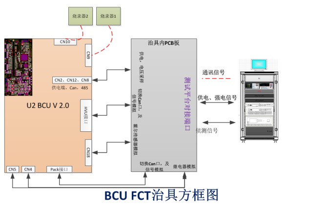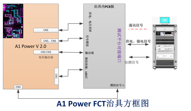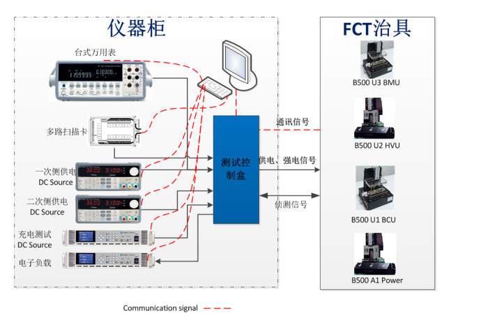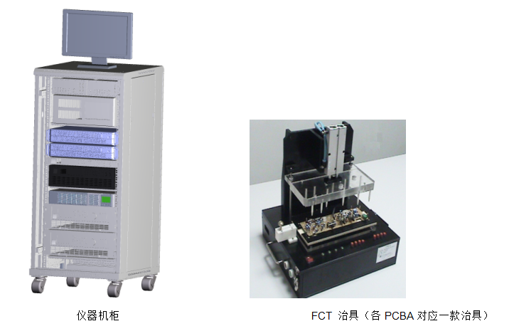 FCT測(cè)試系統(tǒng)由2大部分組成,1. 測(cè)試機(jī)柜(包含PC,儀表,通訊盒) 2. 各PCB板對(duì)應(yīng)針床治具。