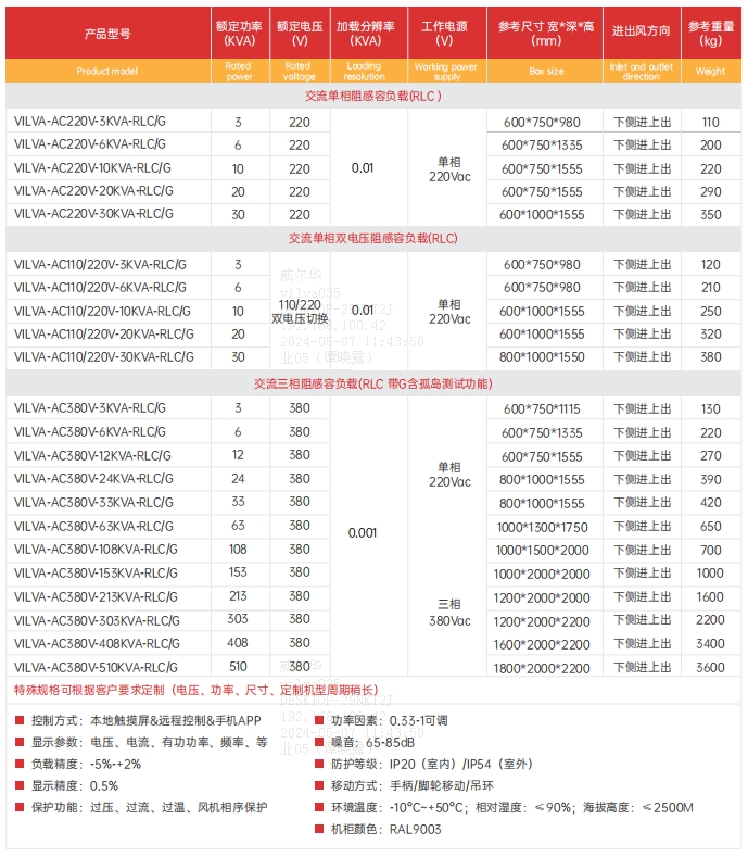 產(chǎn)品規(guī)格:VILVA-RLC交流單/三相阻感容負(fù)載箱