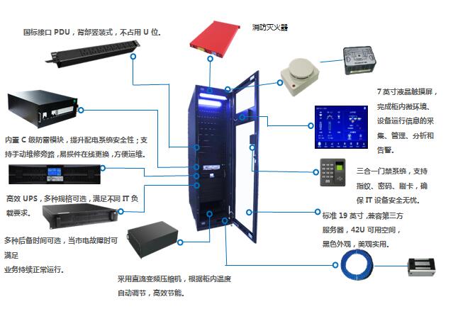 1、一體化設計,集成IT機柜,精密 空調配電,UPS、蓄電池,動環(huán)監(jiān)控