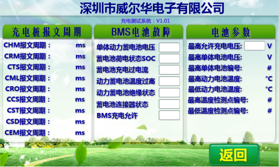 該測試負載通過內(nèi)部BMS 模擬器與電動汽車直流充電樁進行信息交互,實現(xiàn)對電池充電過程的實時模擬與檢測,可以檢測多種規(guī)格的直流充電樁電壓范圍500/1000VDC,測試系統(tǒng)內(nèi)部集成了125KW的負載(功率大小及電壓范圍都可根據(jù)客戶實際要求定制)。本測試負載測試邏輯主要以GB18487-2015中直流充電控制導引為測試依據(jù)。當直流充電機充電槍接入測試設(shè)備接口時,測試設(shè)備按非車載充電機與BMS 通信協(xié)議國標(GB/T 27930-2015)完成連接檢測、充電握手、配置和充電,檢測充電電壓和輔助電源狀態(tài)。